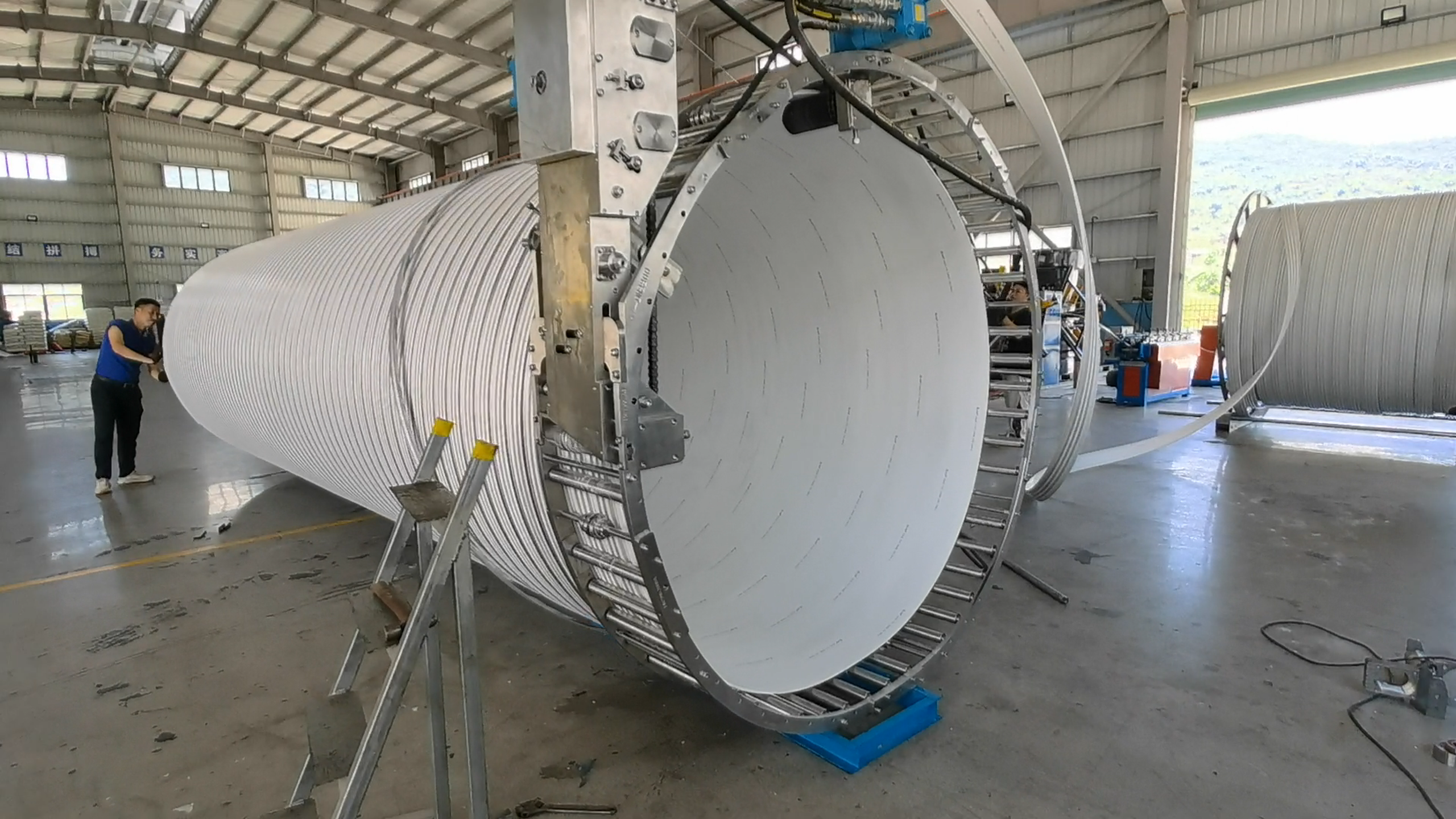 机械制螺旋缠绕内衬修复技术是将可拆解的缠绕机在井下完成组装后,把预制好的PVC-U带状型材及不锈钢带通过检查并输送到缠绕机上,缠绕机将带状型材与不锈钢带同步缠绕行进。通过型材边缘接缝的互锁,最终在原有管道内形成一条连续的、高强度的、具有良好水密性的钢塑加强型新管。